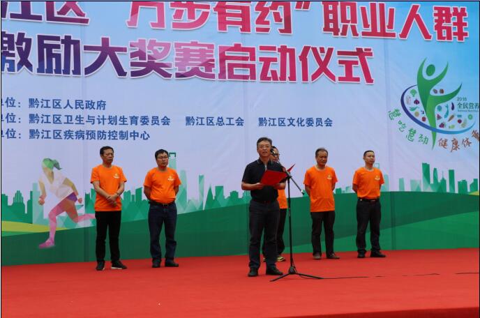 为提升慢性病综合防控示范区建设水平,提高职业人群身体素质,响应国家《健康中国2030》计划。5月9日,黔江区2018年“万步有约”职业人群健走激励大奖赛启动仪式及全民营养周宣传活动在武陵文化广场举行。副区长谢承刚、区总工党组书记张毓亮、区文化委副主任高续进、区卫计委正处级领导郑泽荣 、卫计委副主任林开进、区疾控中心主任崔一敏以及来自41个单位的35支队伍参与启动仪式。