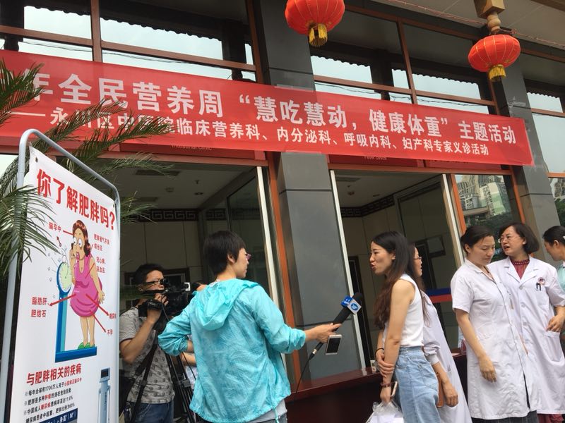 2018年5月19日,永川区中医院积极响应重庆市营养学会和区疾控中心的号召,临床营养科联合内分泌科、呼吸内科以及妇产科专家在医院门前开展了大型义诊和科普知识宣传活动,营养科谢颖主任还深入开展了减重知识的讲座,吸引了许多群众参加,并获得一致好评。此次活动提高了广大群众对健康知识的理解,尤其认识了科学减肥的方法,达到了本次全民营养周“慧吃慧动,健康体重”主题的目标。