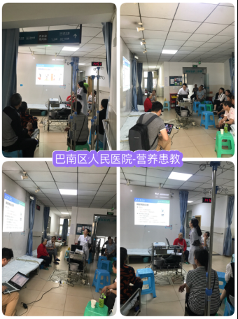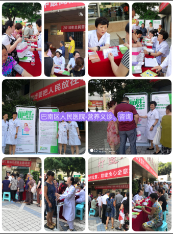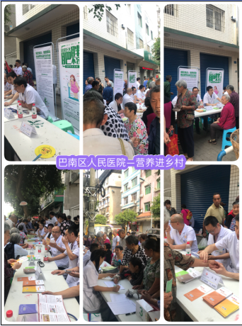517~18日,副主任委员周永教授充分发挥医院营养科在体重控制中的专业优势,联合巴南区内分泌科、肿瘤科、心内科、普外科专业人员在门诊、病房、社区针对患者及其家属开展了系列宣教咨询活动。在“2018年全民营养周暨防治肥胖活动”义诊活动中,她们向前来医院就医的患者及家属讲解营养相关知识、接受健康问题咨询、免费测血压、血糖和身高体重,发放宣传资料600余份。针对超重肥胖人群进行义诊,并现场为前来咨询的BMI28kg/m2的前12名肥胖人员免费赠送营养代餐粉。以“慧吃慧动、健康体重”为口号,倡导通过健康生活方式、平衡膳食、适量运动来促进健康。