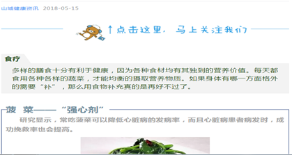重庆市营养学会食品安全与标准专委会渝中片区充分利用山城健康资讯微信公众号平台,采取图文并茂的方式生动诠释2018年全民营养周内容和内涵。在2018年第三期健康之声专栏上,刊载全民营养周宣传核心信息,覆盖辖区所有社区居委会,让更多的人了解“慧吃慧动,健康体重”相关内容,更多的人关注自身营养、自身身体健康状态。在渝中报“健康资讯”专栏上刊载全民营养周核心信息,文字精炼有趣;通过多层次多角度宣传全民营养周,让受众面更广,参与人数更多。
