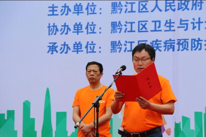 为提升慢性病综合防控示范区建设水平,提高职业人群身体素质,响应国家《健康中国2030》计划。5月9日,黔江区2018年“万步有约”职业人群健走激励大奖赛启动仪式及全民营养周宣传活动在武陵文化广场举行。副区长谢承刚、区总工党组书记张毓亮、区文化委副主任高续进、区卫计委正处级领导郑泽荣 、卫计委副主任林开进、区疾控中心主任崔一敏以及来自41个单位的35支队伍参与启动仪式。