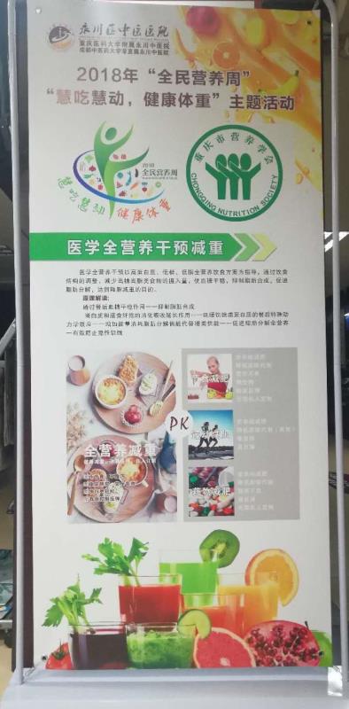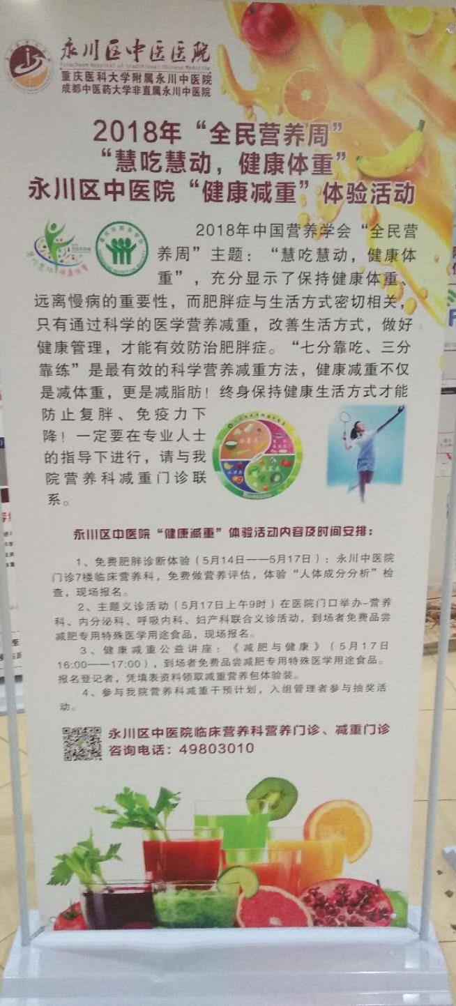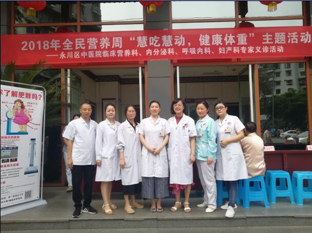 2018年5月19日,永川区中医院积极响应重庆市营养学会和区疾控中心的号召,临床营养科联合内分泌科、呼吸内科以及妇产科专家在医院门前开展了大型义诊和科普知识宣传活动,营养科谢颖主任还深入开展了减重知识的讲座,吸引了许多群众参加,并获得一致好评。此次活动提高了广大群众对健康知识的理解,尤其认识了科学减肥的方法,达到了本次全民营养周“慧吃慧动,健康体重”主题的目标。