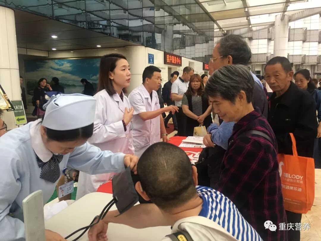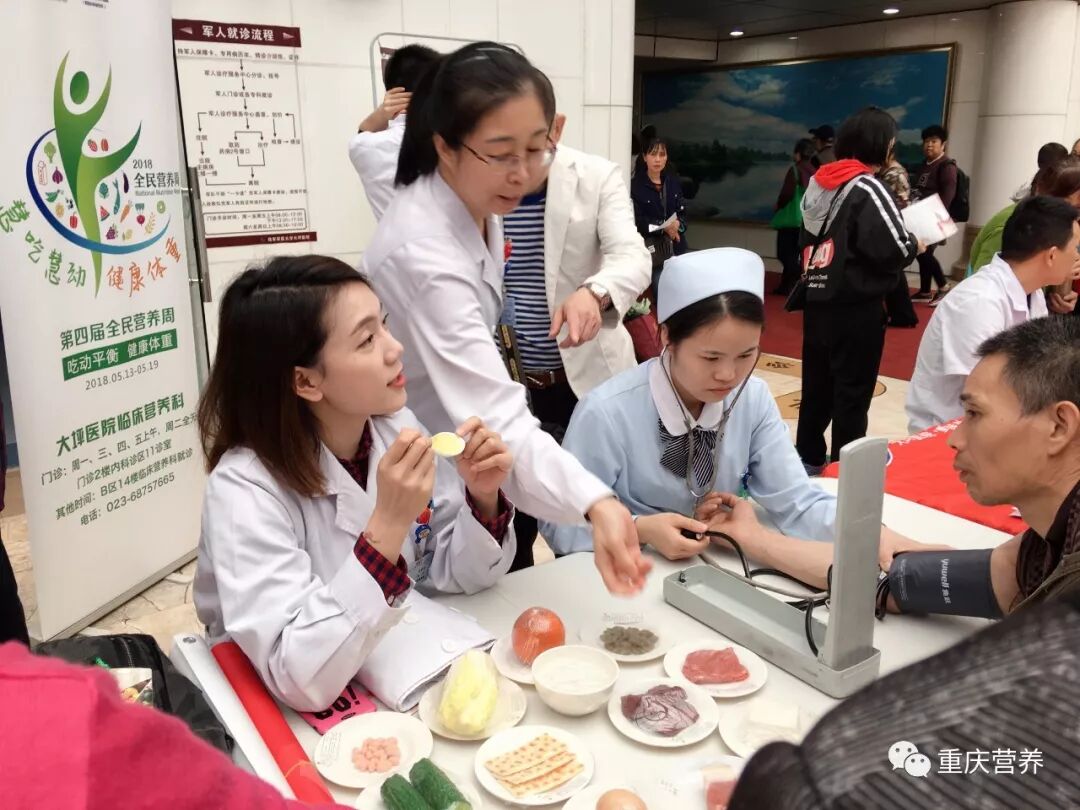 5月11日上午08:30-12:00,由大坪医院营养科、普外科、高血压内分泌科等多名专家组成的多学科诊疗团队,在大坪医院门诊部开展了以“慧吃慧动、健康体重”为口号的第四届“全民营养周”大型义诊活动。本次活动主题为《中国居民膳食指南(2016)》的第二条“吃动平衡,健康体重”,倡导平衡膳食以及健康的生活方式。现场工作人员为咨询者免费测量身高、体重、血压、血糖,发放多种疾病的膳食手册宣传资料,利用食物模型和BMI圆盘生动形象地进行了知识讲解。针对糖尿病、心血管疾病、孕产妇、老年人等不同人群的体重管理进行了个体化指导。活动现场人头攒动、气氛热烈,前来咨询的人员络绎不绝,大家纷纷表示通过此次活动认识到了提倡平衡膳食,保持健康体重的重要性。
