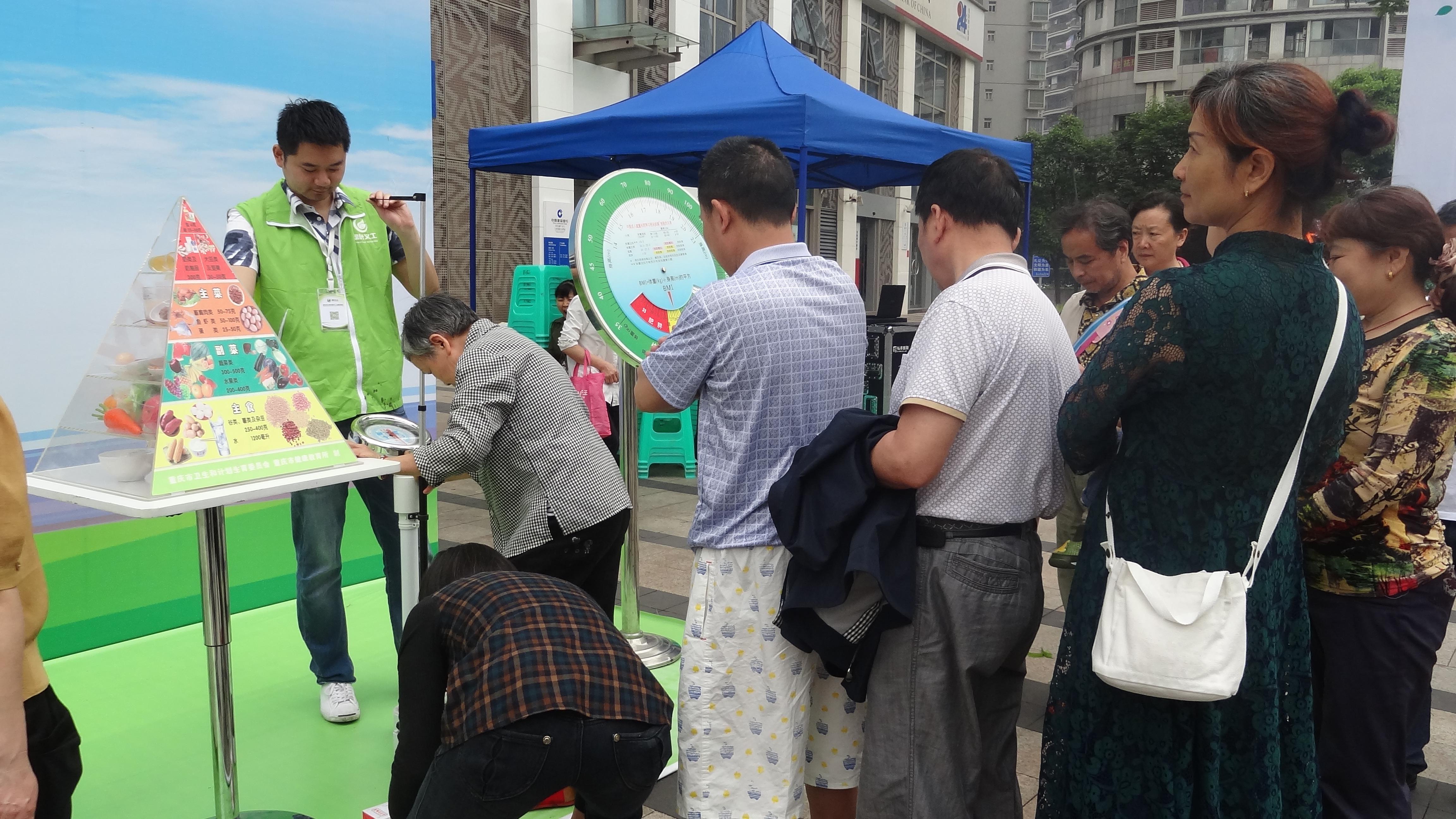 本次活动围绕倡导健康生活方式理念,普及健康技能,推广健康行为,提高健康管理能力来开展。在活动现场,不仅向辖区居民展示了膳食宝塔模型和BMI转盘模型,还通过义诊、咨询等方式向广大居民讲解了如何合理膳食和在三餐中谷物类如何搭配;区疾控中心还将人体成分仪设置在活动现场免费为广大居民检测身体中蛋白质、脂肪、碳水化合物等成分,并一一做了详细解答。活动现场氛围十分热烈,重庆日报、渝中新闻、渝中报等多家媒体进行了深入报道。